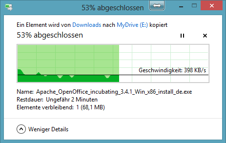 das Problem besteht schon seit Beginn an (April 2012). Der Datentransfer im Netzwerk ist über WLAN eine Katastrophe (siehe Screenshot). Dabei ist es egal, ob ich den USB-Slot am IAD 3232 nutze, meinen NAT-Server mit Daten beschreiben will oder auf andere Rechner zugreifen möchte: über WLAN ist die Datentransferrate nicht zumutbar! Stelle ich auf Netzwerkkabel um, "flutscht" es prima. Egal von wo nach wo, immer so zwischen 6 und 7 MB/s. Ja, es ist nicht wirklich flott, aber das reicht mir. Es liegt auch nicht an meinem Laptop, die anderen Laptops haben das gleiche Krankheitsbild. Als ich noch bei der Telekom war, hatte ich den Speedport W701 im Einsatz, dort lief es mit der jetzigen Hardware ohne Probleme.