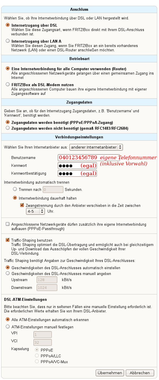 Okay. Sieht so aus, als hätte uns der alte Anbieter raus geschmissen und Alice übernommen. Dann wollen wir mal die Verbindung herstellen. Unter Einstellungen > Internet > Zugangsdaten werden die neuen Zugangsdaten eingetippt. Als Anbieter wählt man "anderer Internetanbieter" aus. Dann unter Benutzername die eigene Telefonnummer (mit Vorwahl) und als Passwort irgendetwas (bei Variante-1 ist das egal) eintippen und ganz unten auf [Übernehmen] klicken. Hex-hex!