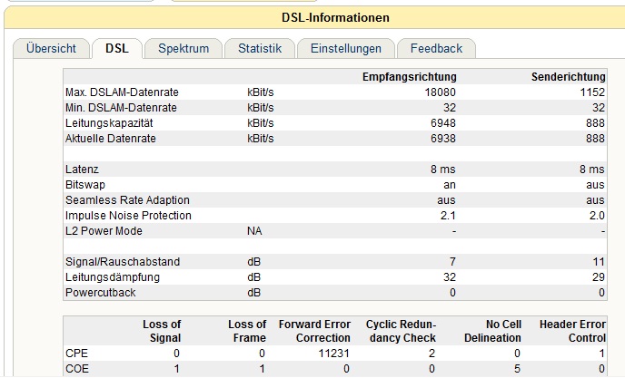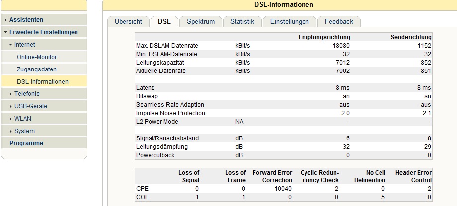 Die Leistungsdaten meiner Leitung habe ich mit einer Fritz.Box gemessen: