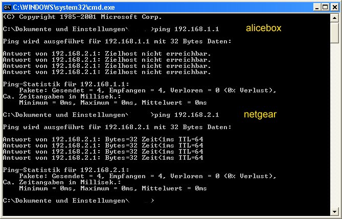 sykes hat geschrieben:War auch nur eine Vermutung von mir. Zudem hatte ich übersehen, dass der Netgear in einem eigenen Subnetz hängt, also .2.1 am Ende. Dann funktioniert der Netgaear auch nicht als Switch und deshalb konnte der Ping auch nicht bis zur Alice-Box kommen.
