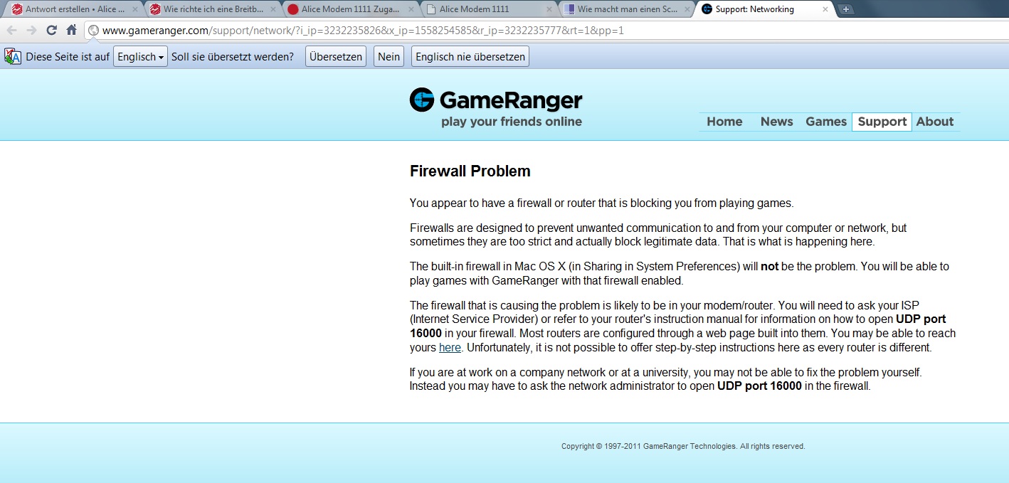 ich versuche in Internet zu spielen. bei neueren spielen klappt es. jetzt habe ich versucht Stronghold Crusader zu spielen und es funktioniert nicht. und zwar, erscheint die meldung, dass UDP-Port 16000 zu öffnen sei und ich dazu meinen ISP (Internet Service Provider) kontaktieren muß, also Alice. meine freunde haben solche probleme nicht und es ist natürlich schade nicht mitspielen zu können. vielleicht kennt sich jemand mit dem Alice Modem 1111 und weiß wie man da den Port öffnen kann?