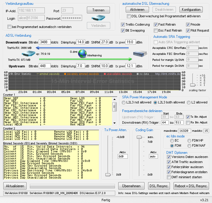 Ruf mal bei Alice an, und lass dich auf ein 18000er Profil setzen, dann poste hier nochmals die Werte (ein Screenshot von DMT wäre natürlich noch besser).