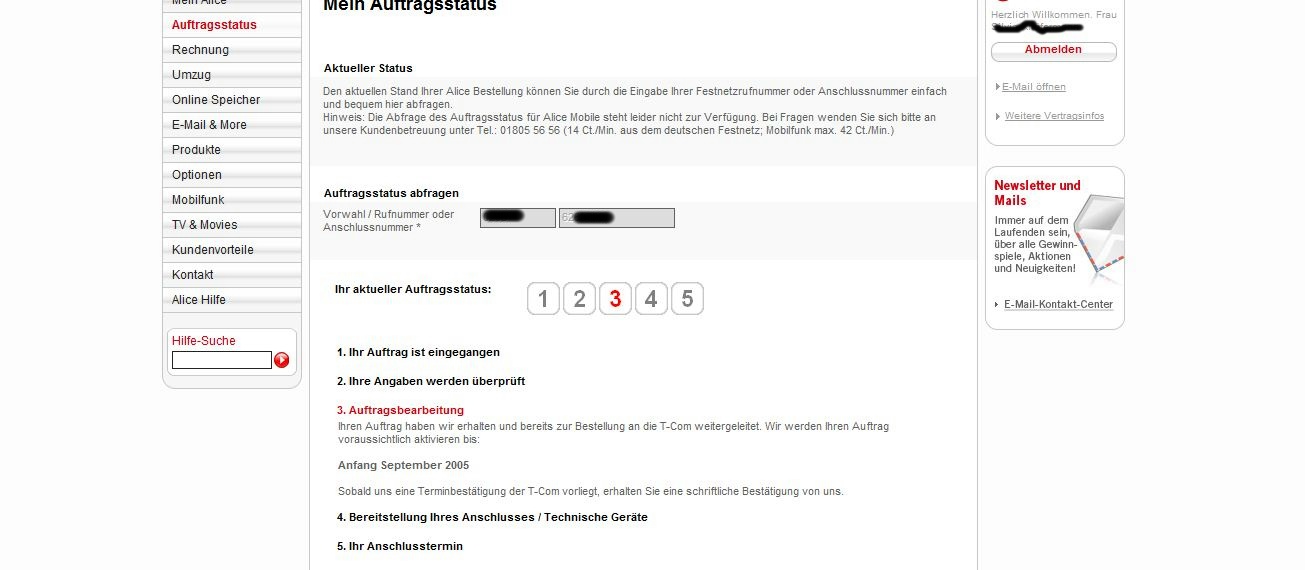 Zwischendurch Telfeonisch, per E-Mail und auch per Fax angefragt was nun ist. Keine Antwort!!, am Telefon kann mir auch keiner weiterhelfen. Zum Glück gibt es ja die Alice Loung, mal den Auftragsstatus abfragen und siehe da: Siehe Dateianhang.