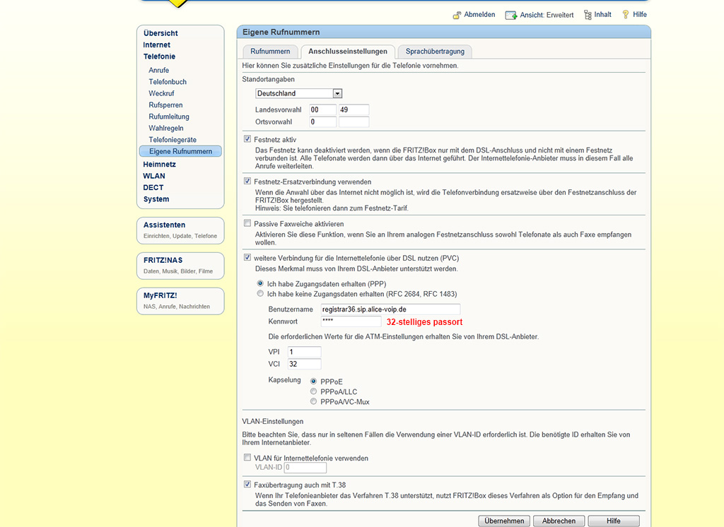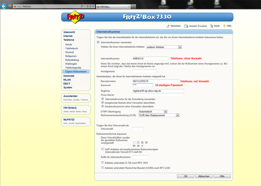 das 32-stellige Passwort und die registrar (registrar36.sip.alice-voip.de)