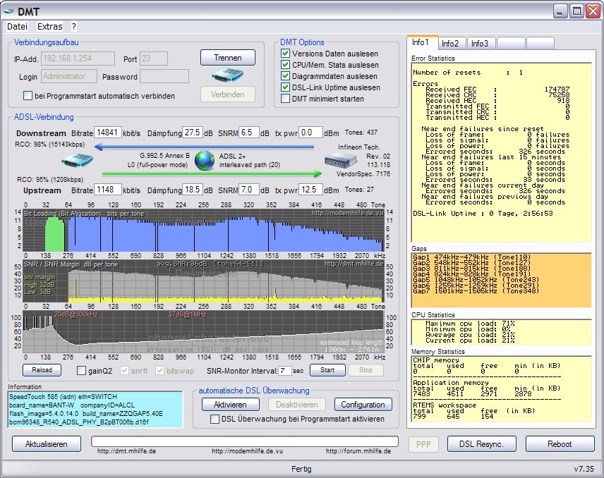 Also dann hier mal die Werte vom Speedtouch 585 Alice Modem: Leitungslänge hab ich allerdings noch nicht erfragt.