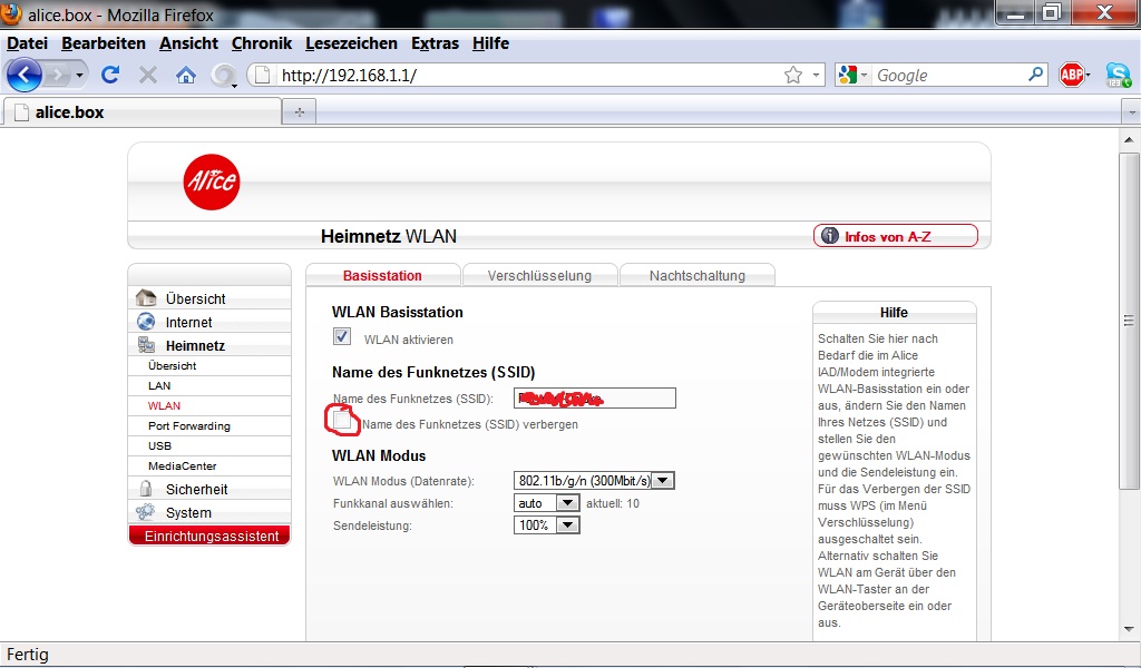 hallo leute ich habe am 22.11.2010 .für Alice Modem WLAN 1231 die neuste firmware aufgespielt und zwar hatte ich folgendes problem in verbindung mit ip tv funktionierte die wlan verbindung zum laptop nicht mehr (eigeschränkte connektivität ) bis hin zu abbrüchen. dieses problem konnte das update beseitigen jetzt taucht plötzlich ein neues problem auf die ssid lässt sich zwar umbenennen aber nicht mehr verbergen das kästchen kann man nicht anhaken. hat jemand eine idee ????