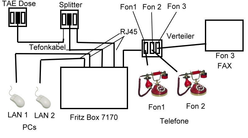 FritzBox7170 + 2 analoge Telefone + 1 ISDN-Telefon + DSL-Splitter (Hama)