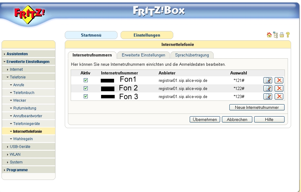 Ich habe seit heute meinen Alice Anschluss und habe es mittlerweile geschafft, dass Internet und Telefonie mit der Fritzbox Fon Wlan funktioniert. Allerdings hab ich auch das bekannte Problem, dass ich nicht angerufen werden kann. Ich habe eine Internettelefonienummer von Sipgate. Wie muss ich die FB konfigurieren, dass auch diese Nummer funktioniert. Mir scheint, dass die erweiterten Einstellungen, die für Alice notwendig sind, die Registrierung der Sipgate Nummer verhindert. Ich würde gern die eingehenden Anrufe auf die Sipgatenummer umleiten.