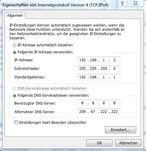 kurtbachmann hat geschrieben:1. Soll ich in der Reiterkarte "Allgemein" der Eigenschaften von IPv4 die bisherige Einstellung " IP-Adresse automatisch beziehen" ändern in "Folgende IP-Adresse verwenden: IP-Adresse: 192.168.1.2"?