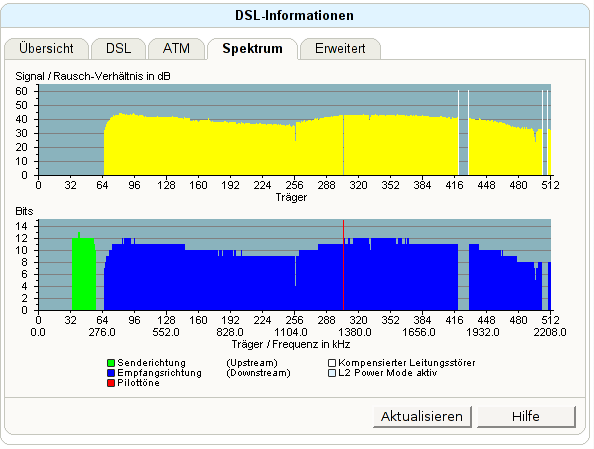 Ich habe mal die Fritzbox ohne Sphairon ans Netz gehängt, mir die DSL-Daten angesehen und die Grafiken kopiert. Was haltet Ihr davon? Meint Ihr, ein Hotline-Anruf mit Bitte um Profil-Update würde sich lohnen?