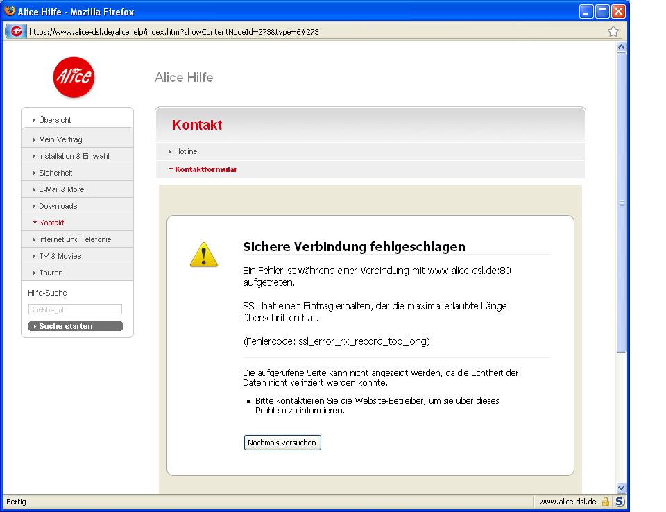 Wenn man versucht das Kontaktformular bei Alice zu nutzen um zum Beispiel eine Störung zu melden dann bekommt man eine Fehlermeldung. Mit dem Internet Explorer klappt es. Die , die bei Alice dieses Kontaktformular programmiert haben haben wohl sehr schlampig gearbeitet. Als Anhang hab ich ein Abbild des Fehlers hinzugefügt