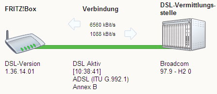 Ich habe dann eine Fritz.Box angeschlossen und die DSL-Infos geprüft: ADSL2+ (G.992.5).