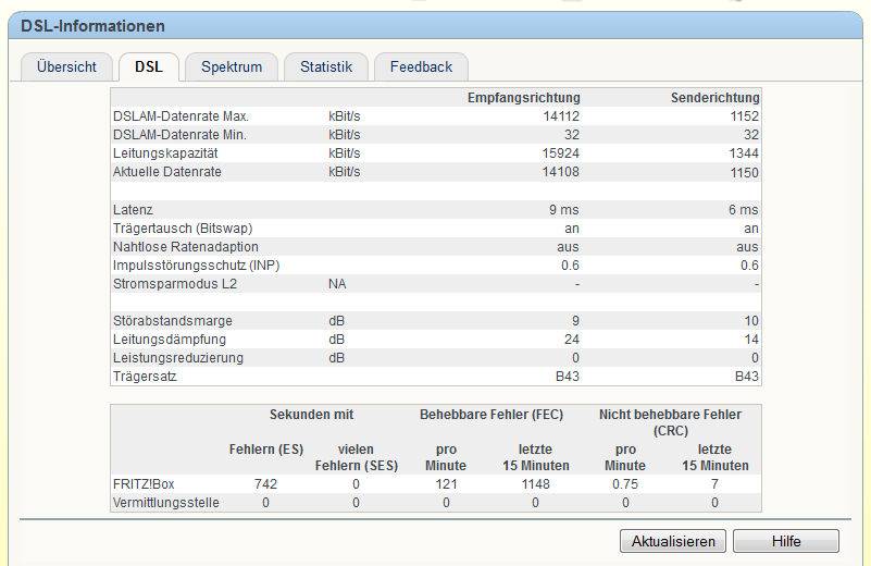 Hier nochmal ein Screen vom Spektrum. Meiner Meinung auch zuviele Leitungsstörer und hin und wieder gehen die CRC Fehler auch schon mal auf über 2000 pro min.