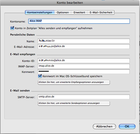 ich habe in meinem Microsoft Entourage 2008 mein Alice IMAP Konto eingerichtet.