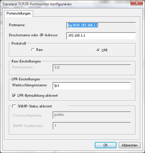 ich versuche seit Tagen einen USB Drucker (HP LaserJet 1018) über die Alice Homebox anzuschließen. Wenn ich den Drucker anschließe erscheint er auch in der Übersicht der USB Geräte (Bezeichnung: "Hewlett-Packard: HP"). Ich habe Win Vista (32) und richte einen Drucker über Drucker hinzufügen -> lokalen Drucker hinzufügen -> neuen Anschluss erstellen -> Standard TCP/IP Port. Danach lasse ich die Auswahl automatische Erkennung des Gerätetyps stehen und gebe als Anschlussname die IP Adresse der Homebox an (192.168.1.1). Danach führt der Wizard eine automatisch Erkennung durch, wobei der Drucker nicht erkannt wird. Daher werden zusätzliche Portinformationen eingegeben. Hierbei habe ich zwei Varianten getestet. Zum einen Protokoll Raw und Port 9110. Zum anderen Protokoll LPR, Warteschlangenname lp und LPR-Bytezählung aktiviert. Mit beiden Einstellungen wollte ich eine Testseite drucken. Beim Drucker kam diese Testseite allerdings nicht an.