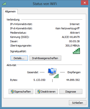 Ich habe seit 3 Wochen Win8 Pro drauf. Mit Win7 war es vorher auch schon, am Betriebssystem liegt es auch nicht. Ich habe aber noch an den Netzwerkadaptereinstellungen getunt, nun habe ich zwischen 270 und 300 MBit-Verbindung (siehe Anhang). Das ist der Grund, warum ich nicht gerne meinen Speedport 701 als WLAN-Router dazwischen schalten will. Habe ja extra den "großen" Router für 49,-- bei Alice genommen, DAMIT ich die große WLAN-Bandbreite nutzen kann.